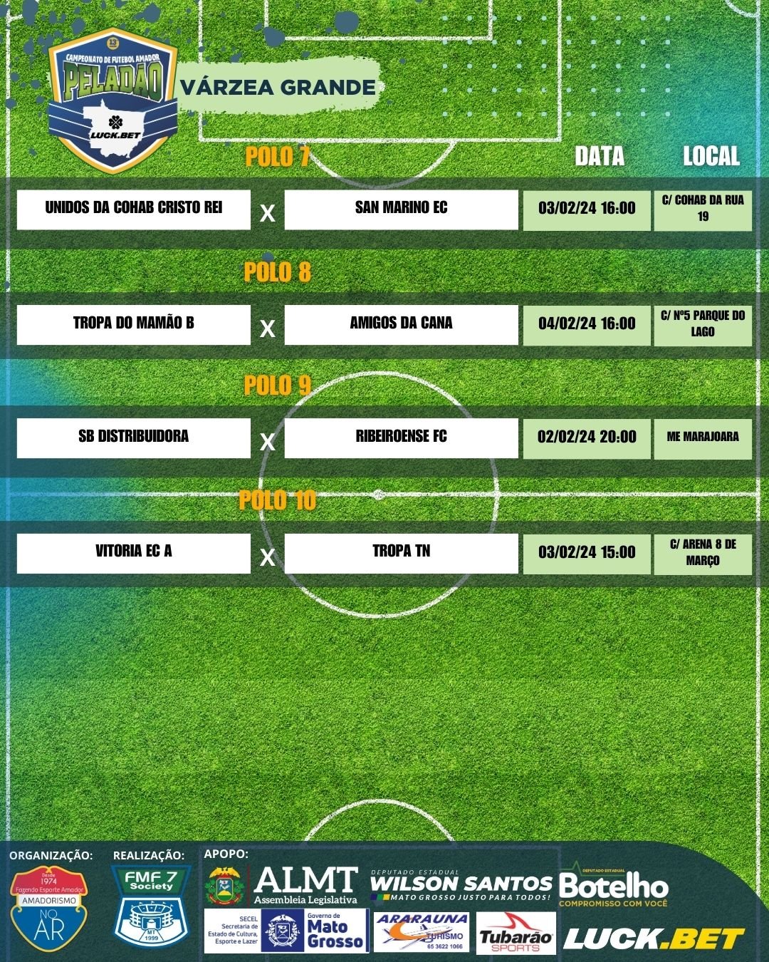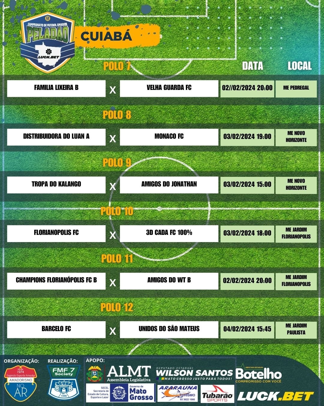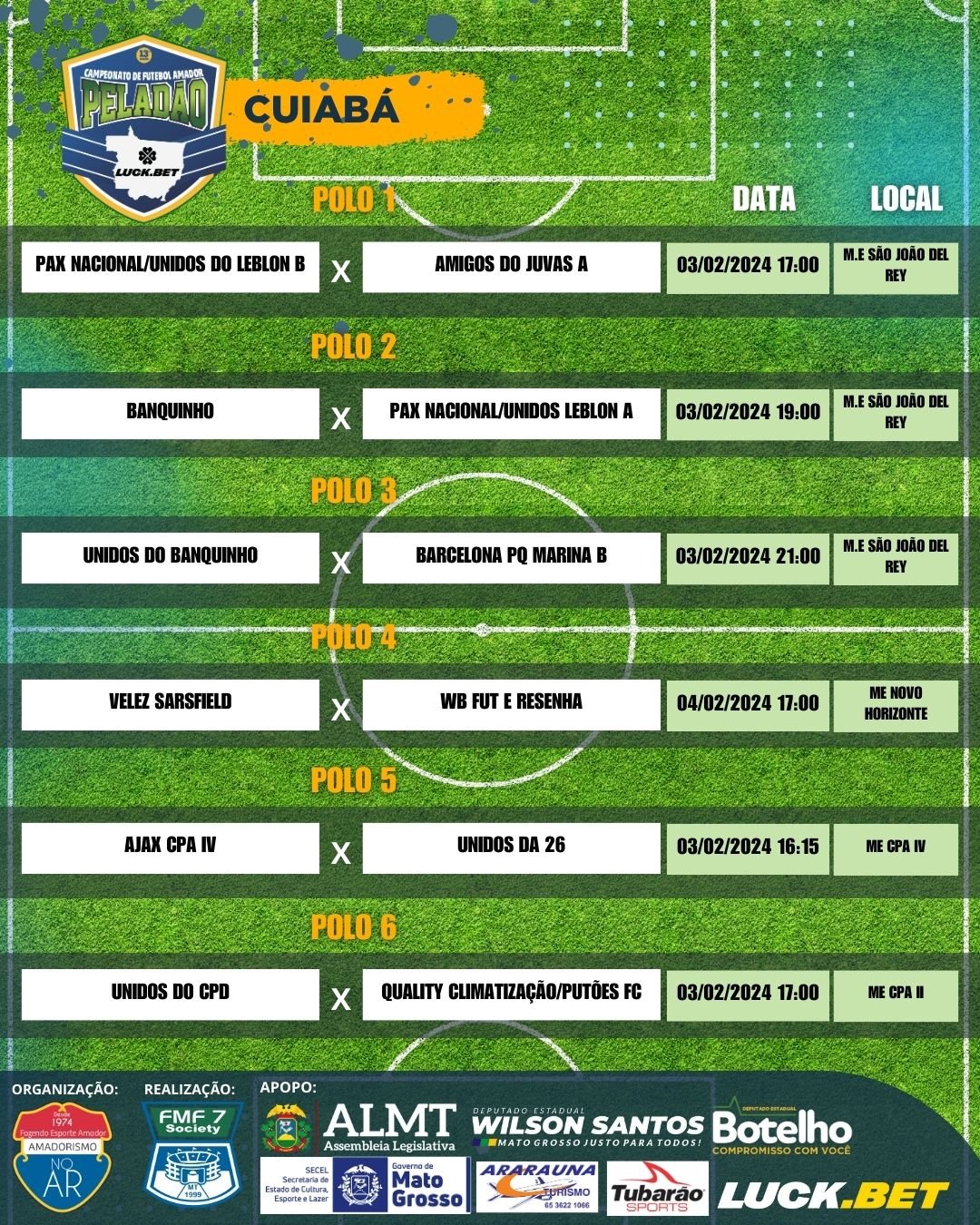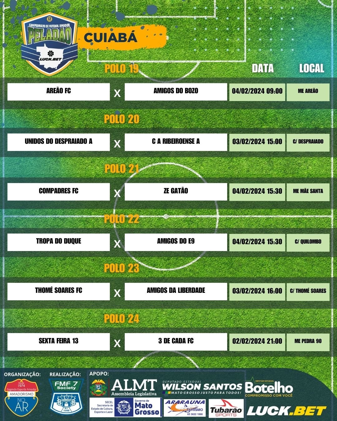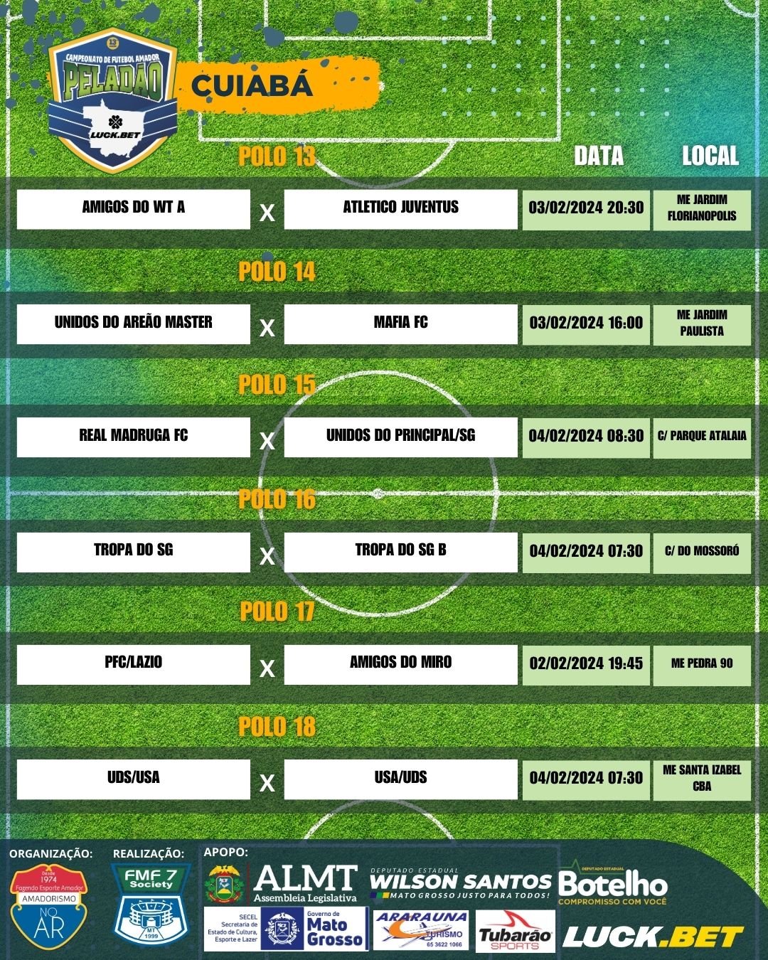 Chegou o momento mais esperado! A terceira rodada do Peladão Luckbet em Cuiabá e Várzea Grande está prestes a começar neste próximo fim de semana, nos dias 02, 03 e 04 de fevereiro. Esteja preparado para testemunhar um espetáculo de talento e emoção nos campos! Não deixe escapar nenhum detalhe; fique atento para acompanhar todas as partidas e se empolgar com as jogadas extraordinárias. Quais jogadores se destacarão nesta emocionante rodada?