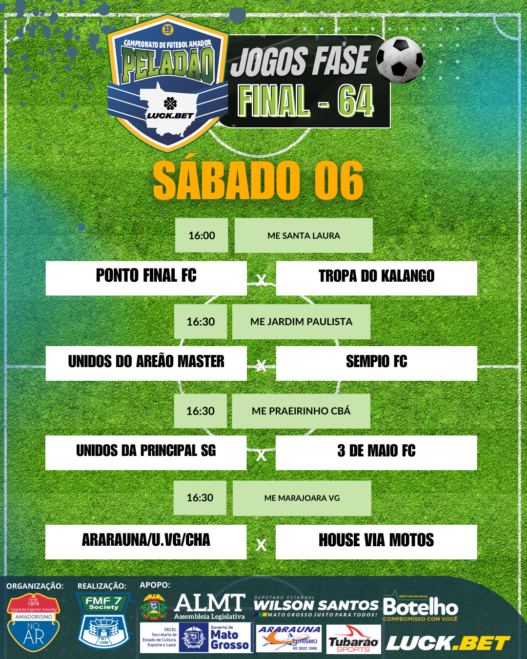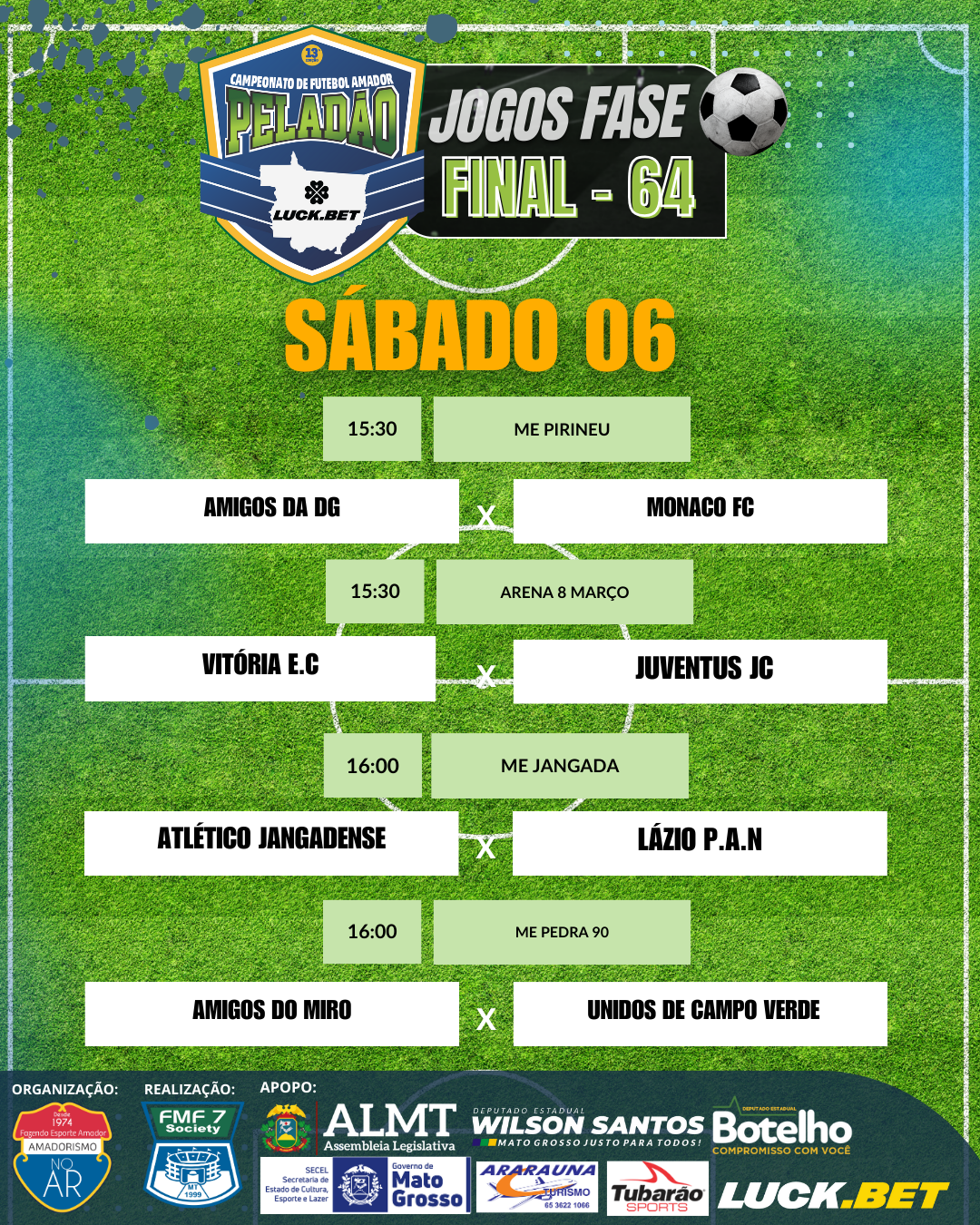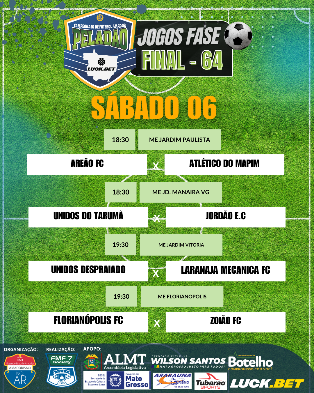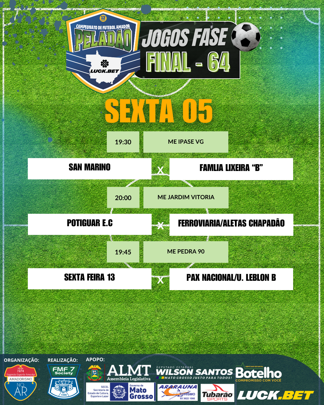 Já estão definidos os jogos da fase 64 do Peladão Luck.Bet, o maior campeonato de futebol amador do Brasil. Os jogos começam na próxima sexta-feira (5) e seguem até domingo (7).