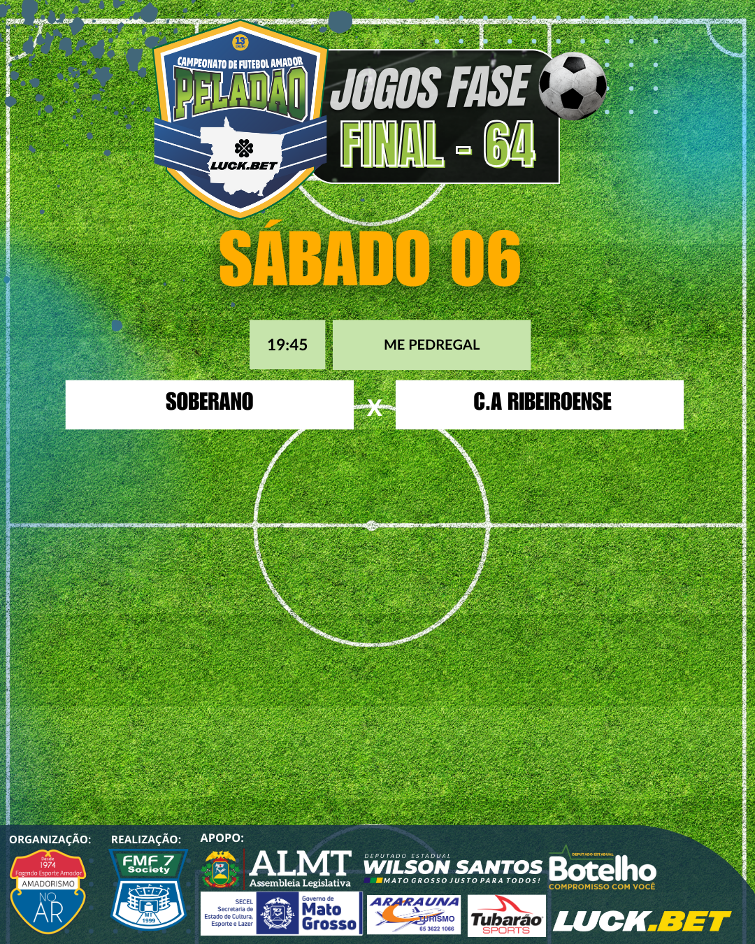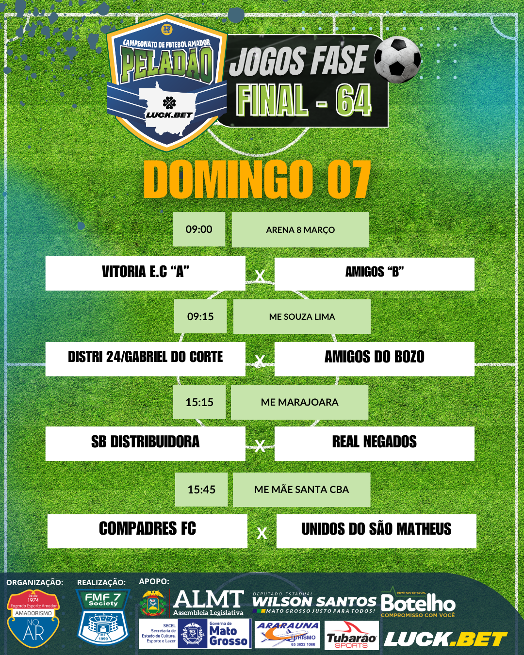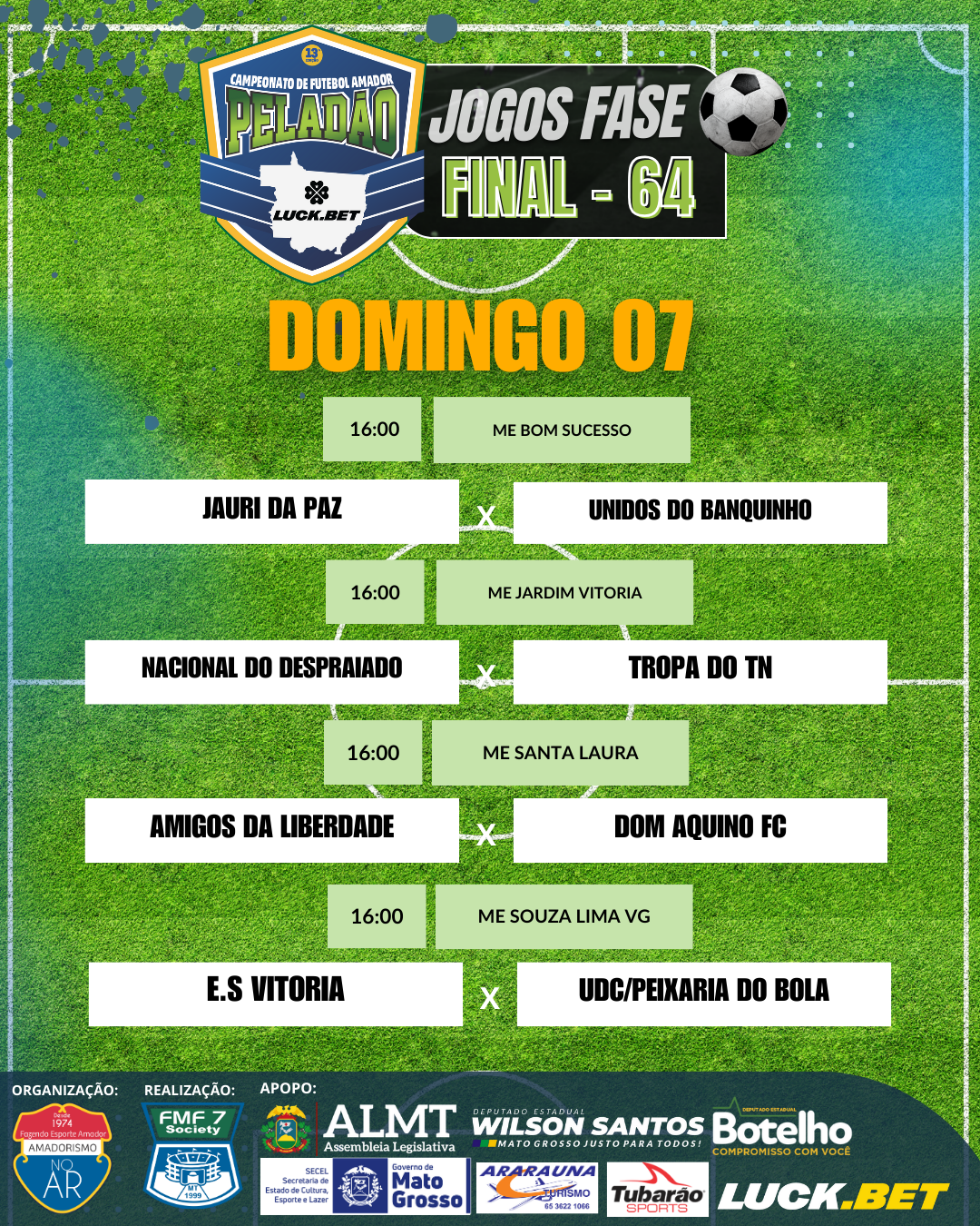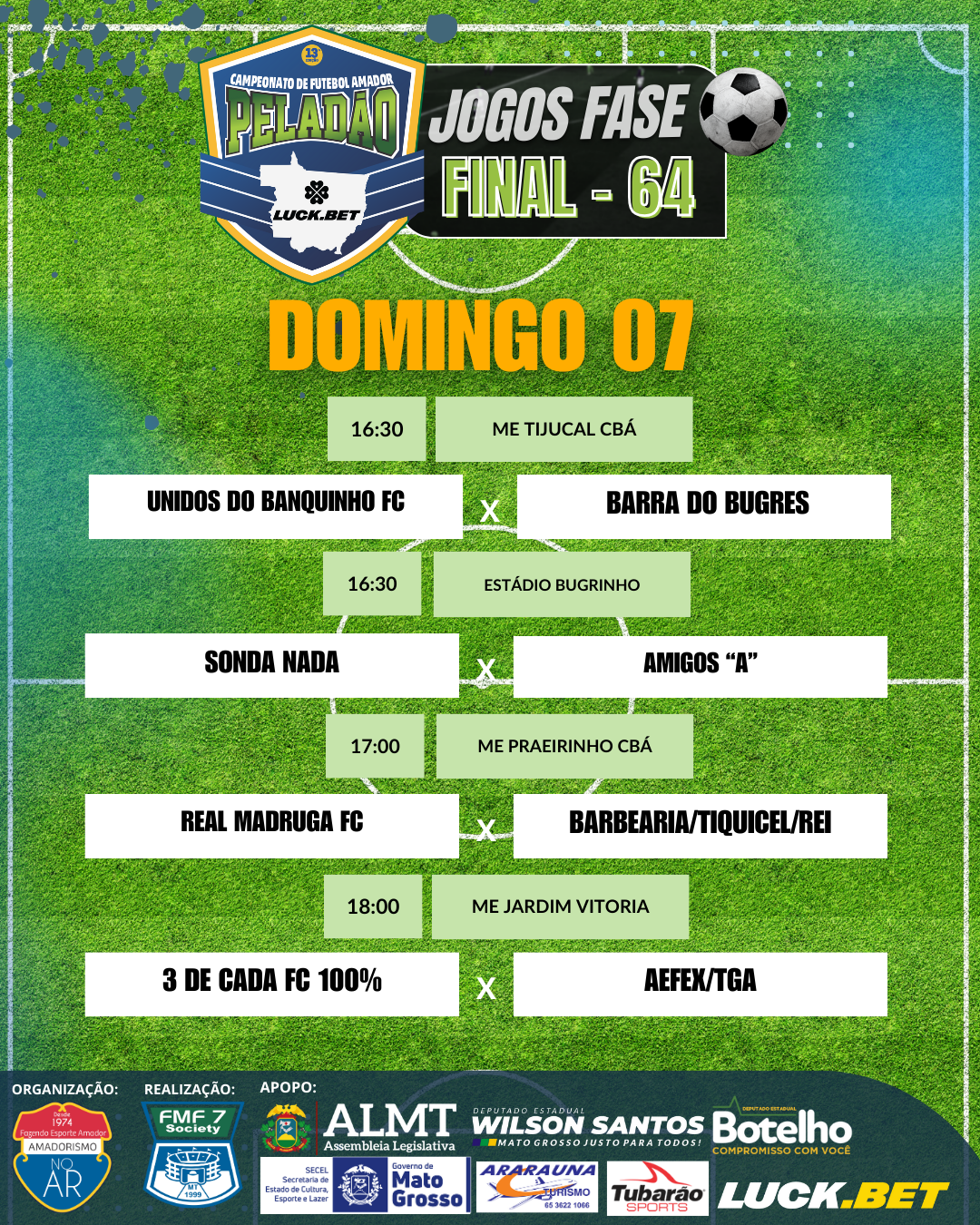 Já estão definidos os jogos da fase 64 do Peladão Luck.Bet, o maior campeonato de futebol amador do Brasil. Os jogos começam na próxima sexta-feira (5) e seguem até domingo (7).