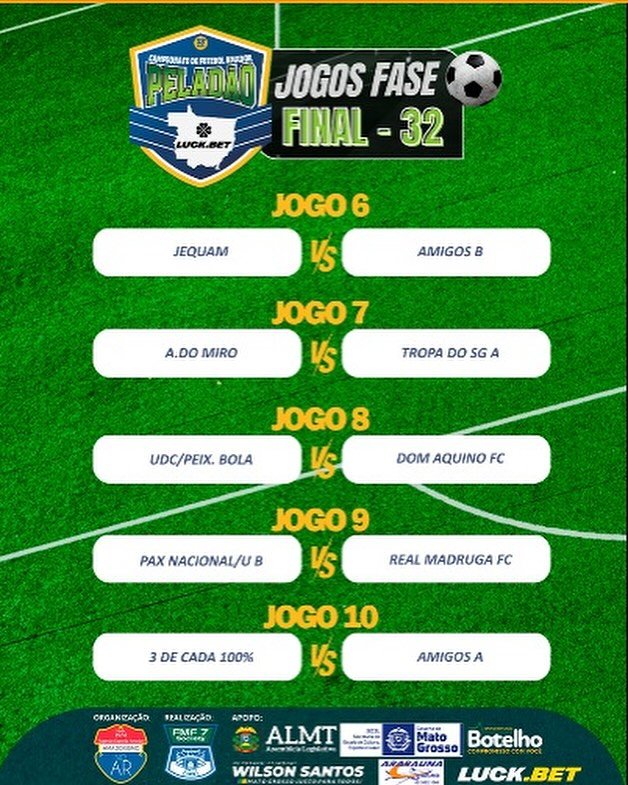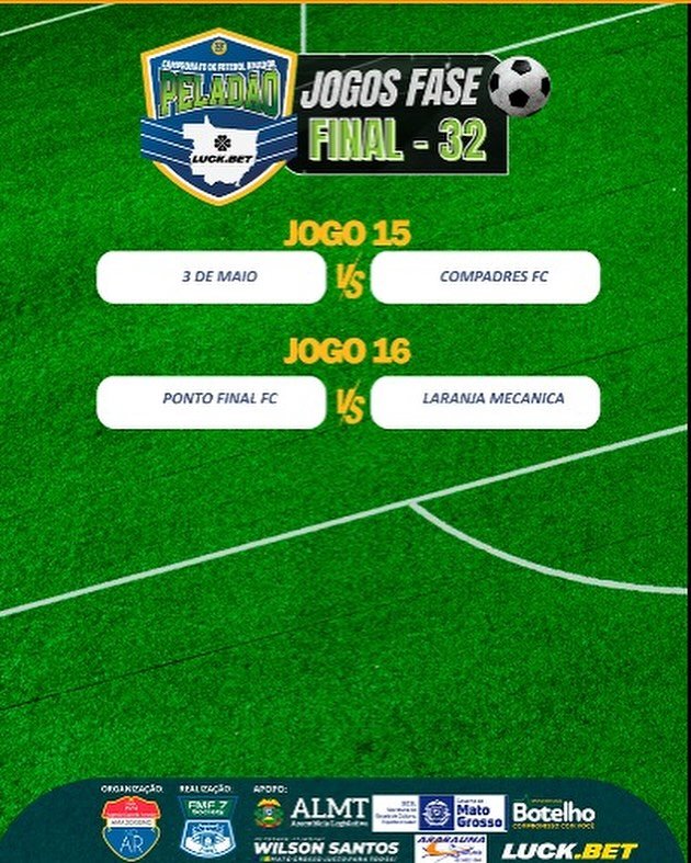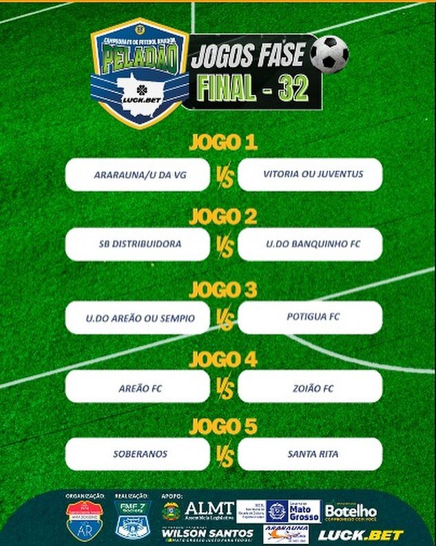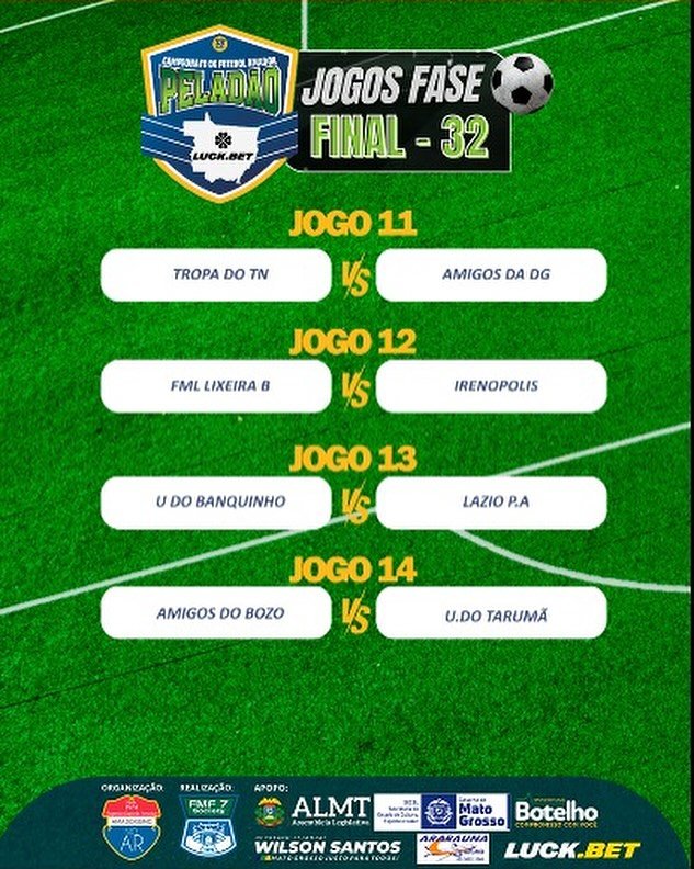 Já estão definidos os 16 confrontos da nova fase do Peladão Luck.Bet. O sorteio dos jogos foi realizado nesta quinta-feira (11), ao vivo, em live transmitido pelo canal @amadorismonoar no YouTube.