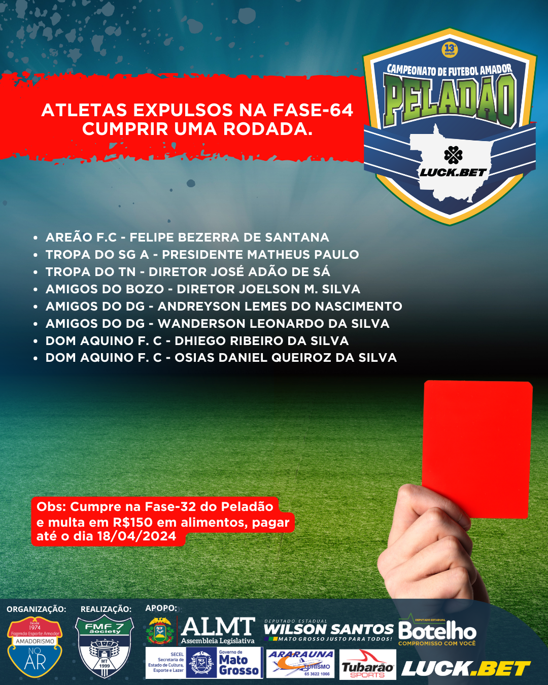 Para os atletas que foram expulsos durante a fase-64 e estão agora cumprindo suspensão na fase-32, é obrigatório o pagamento de uma multa no valor de R$150 em alimentos. Esta multa deve ser quitada até o dia 18/04/2024. É fundamental que o pagamento seja efetuado dentro do prazo estipulado para evitar quaisquer inconvenientes futuros.