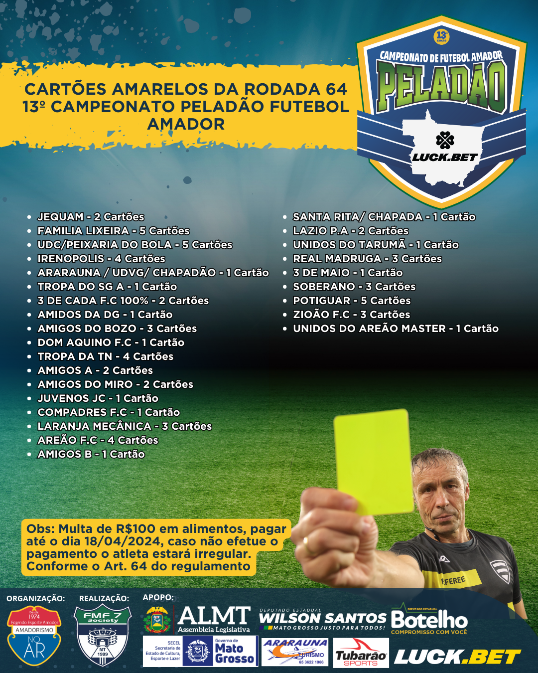 Além disso, aqueles que receberam cartão amarelo devem estar cientes de que uma multa no valor de R$100 em alimentos também deve ser paga até a mesma data, 18/04/2024. Esta é uma medida para garantir a responsabilidade e a ordem dentro do torneio.