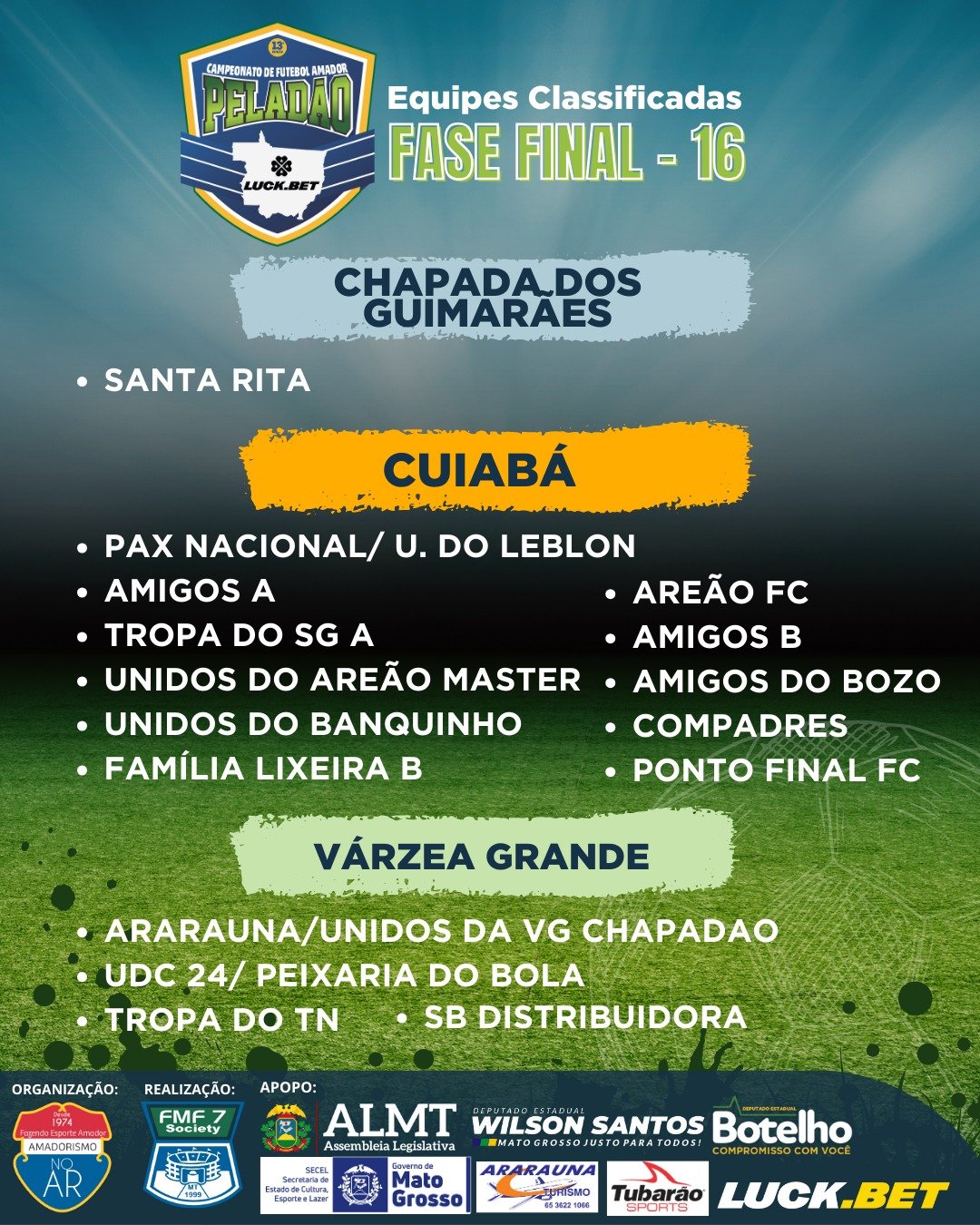 - Várzea Grande: Quatro equipes representarão Várzea Grande nas oitavas: Ararauna/Unidos da VG Chapadão, UDC 24/Peixaria do Bola, Tropa do TN, e SB Distribuidora.