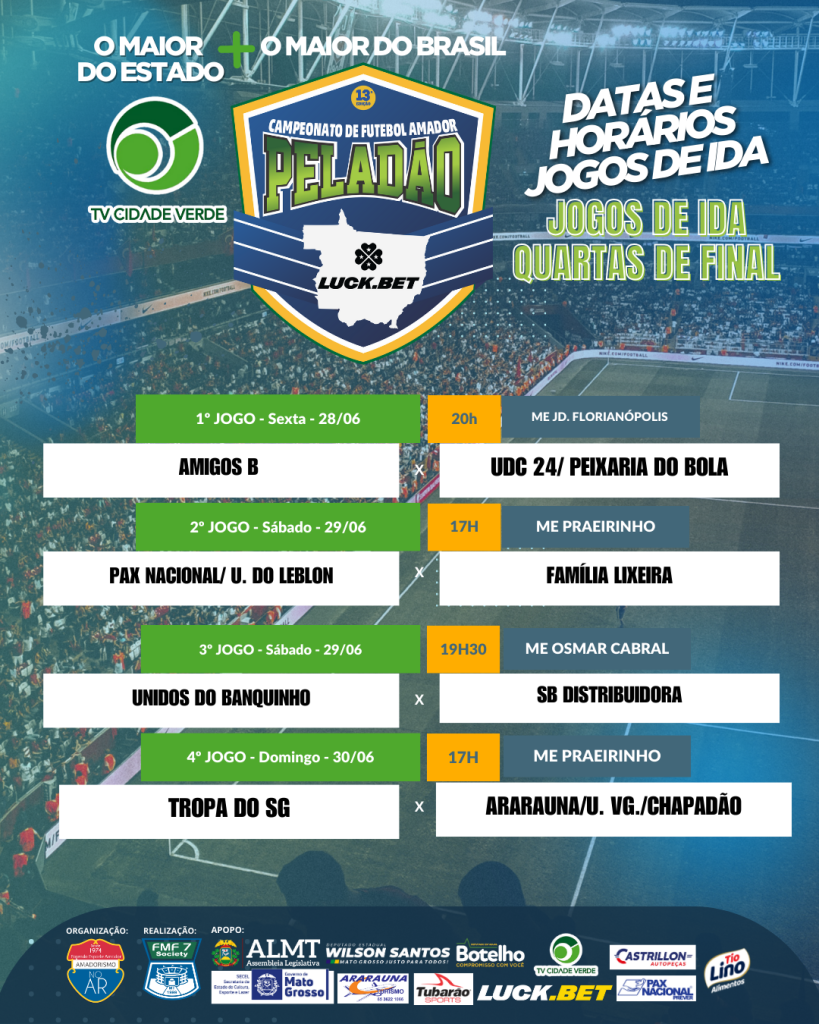 Os jogos de ida das quartas de final do Peladão Luck.bet já estão definidos, prometendo muita emoção e disputas acirradas. A competição avança com quatro partidas que ocorrerão entre sexta-feira e sábado. Veja abaixo os detalhes dos confrontos: